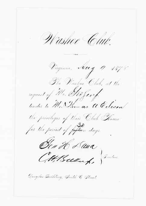 [D7802ZUY], Letter from Washoe Club to Thomas Alva Edison, August 9th, 1878 1878-08-09 -
