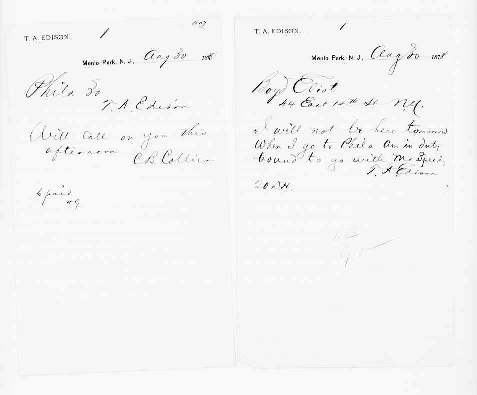 [D7802ZXJ], Telegram from Thomas Alva Edison to Edward Hibberd Johnson, August 31st, 1878 1878-08-31 -